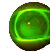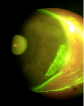 The glowing areas of the cornea have been stained with a dye called fluorescein then observed using a blue light and written filter.